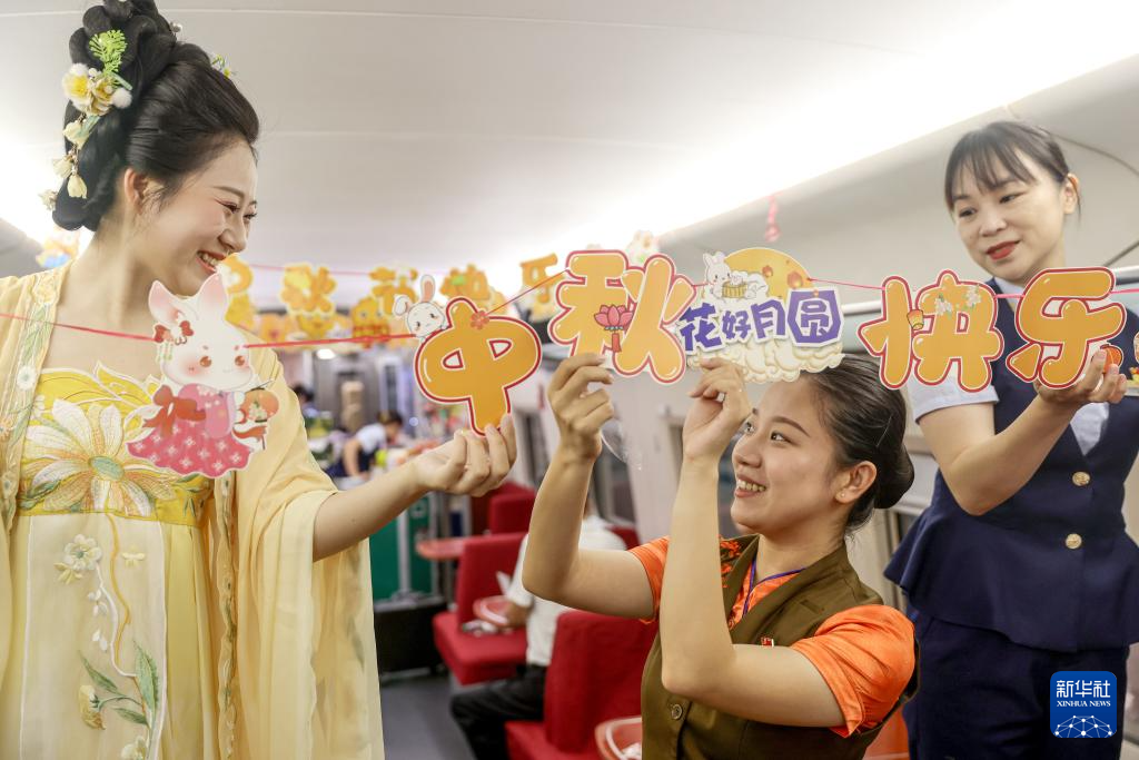 9月16日,在G1005次列车上,列车工作人员布置迎中秋装饰挂件。