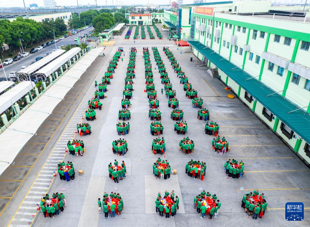 9月16日,在江苏省兴化经济开发区一家食品公司,员工们在进行“博饼”游戏比赛(无人机照片)。
