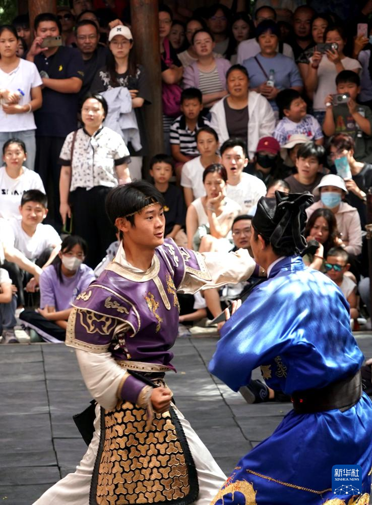 9月16日,游客在位于河南省开封市的万岁山武侠城内观看表演。