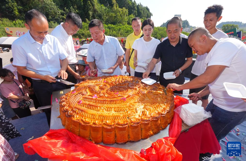 9月16日,四川省遂宁市安居区海龙村村民和游客分享直径一米的月饼。