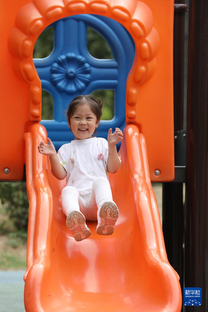 9月16日,一名小朋友在河南省焦作市温县子夏公园儿童运动区玩滑梯。