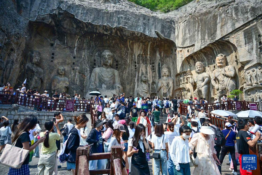9月16日,游客在河南省洛阳市龙门石窟景区内游览。