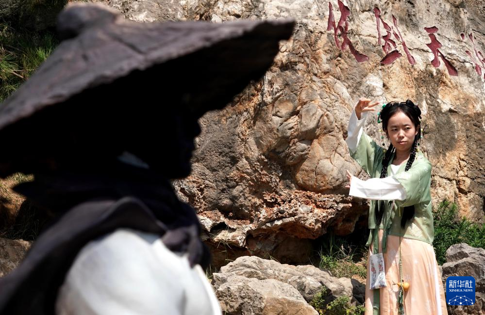 9月16日,身着传统服饰的游客在位于河南省开封市的万岁山武侠城内拍照。