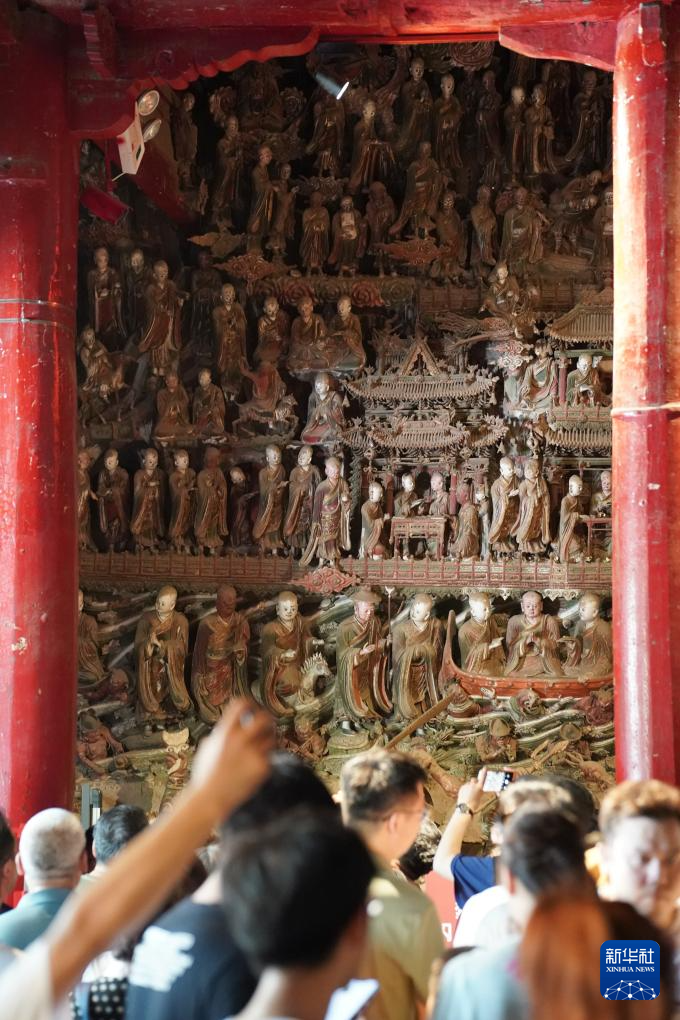 9月16日,游客在陕西西安蓝田县水陆庵内参观彩色壁塑。