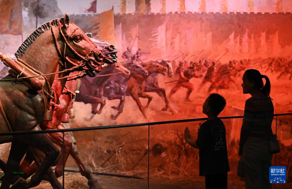 9月16日,家长和孩子在山东滕州博物馆内参观。