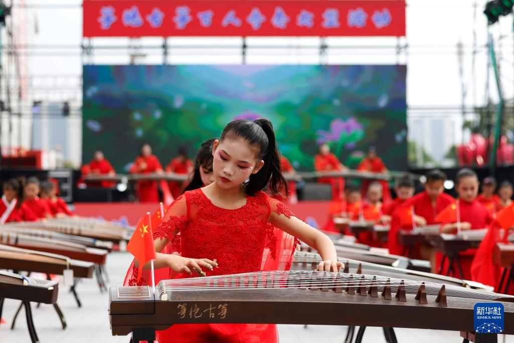 9月16日,小朋友们在江苏省泗洪县城区弹奏古筝。