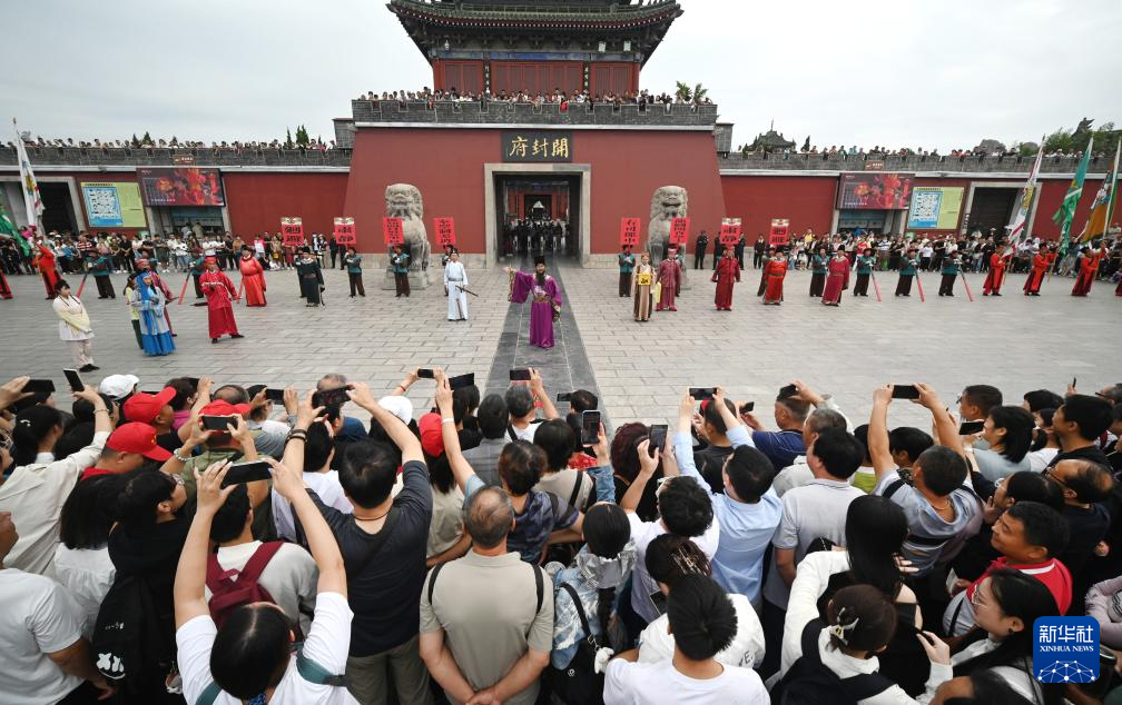 9月16日,游客在河南省开封市开封府门前观看《开衙迎宾》仪式。