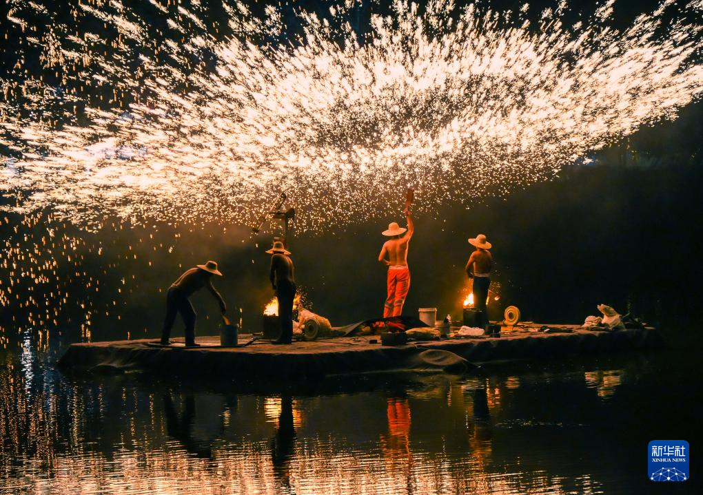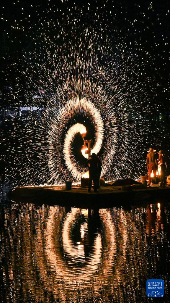 这是9月16日在安徽省宿州市砀山县梨小萌欢乐梨园景区拍摄的打铁花表演。