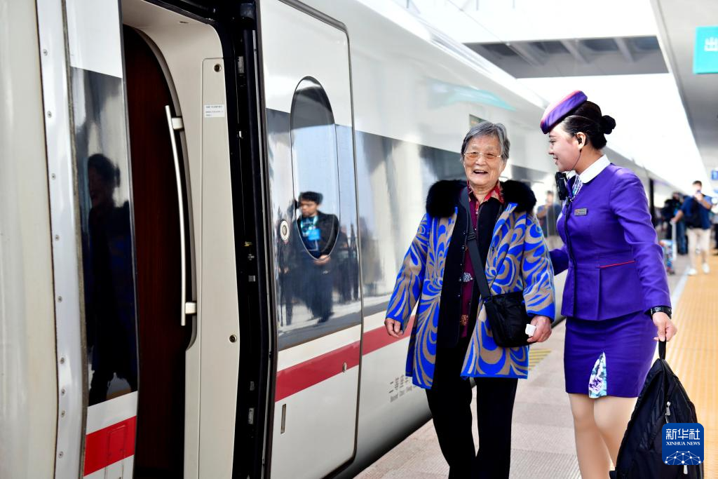10月21日,在潍烟高铁莱州站,列车工作人员帮助一位老人乘坐复兴号G9227首发列车。