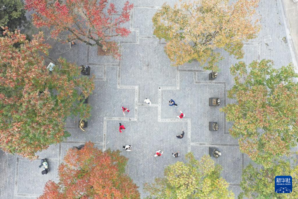 11月13日,晨练爱好者在浙江省湖州市德清县乾元镇双拥国防主题广场健身(无人机照片)。