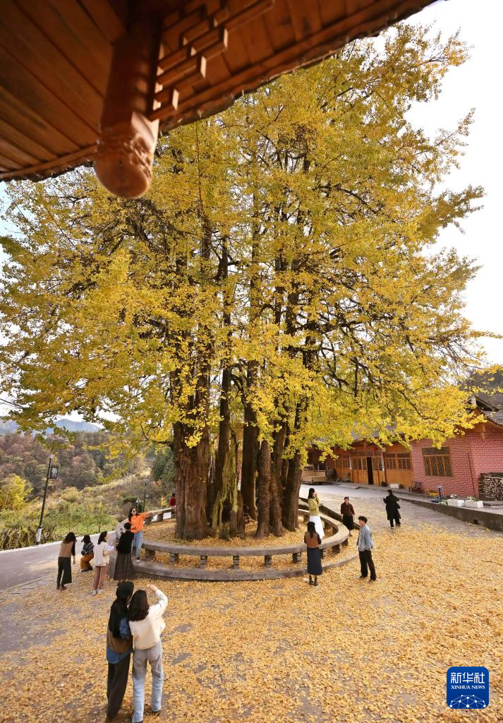 11月11日,游客在湖北省宣恩县东门关村古银杏树下游玩。