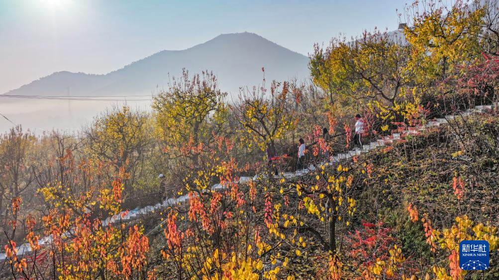 11月12日,游客在河北省遵化市娘娘庄镇的南山常乐谷景区赏景游玩(无人机照片)。