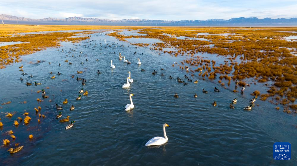11月12日,在甘肃省酒泉市阿克塞哈萨克族自治县阿伊纳乡小苏干湖,天鹅与野鸭在觅食、嬉戏(无人机照片)。
