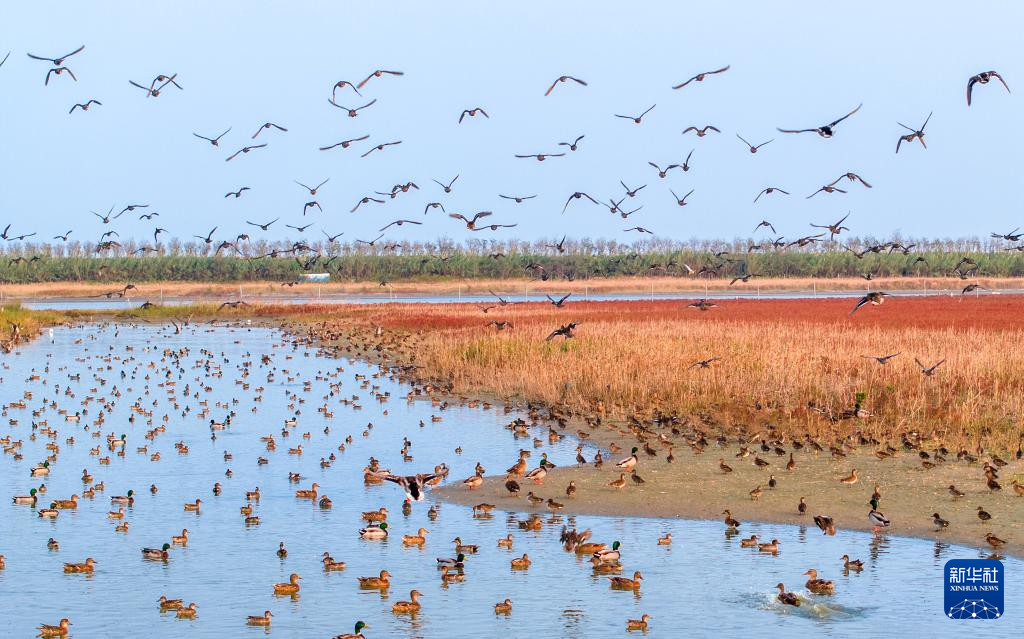 11月12日,雁鸭类候鸟在江苏东台条子泥湿地停歇、飞翔(无人机照片)。