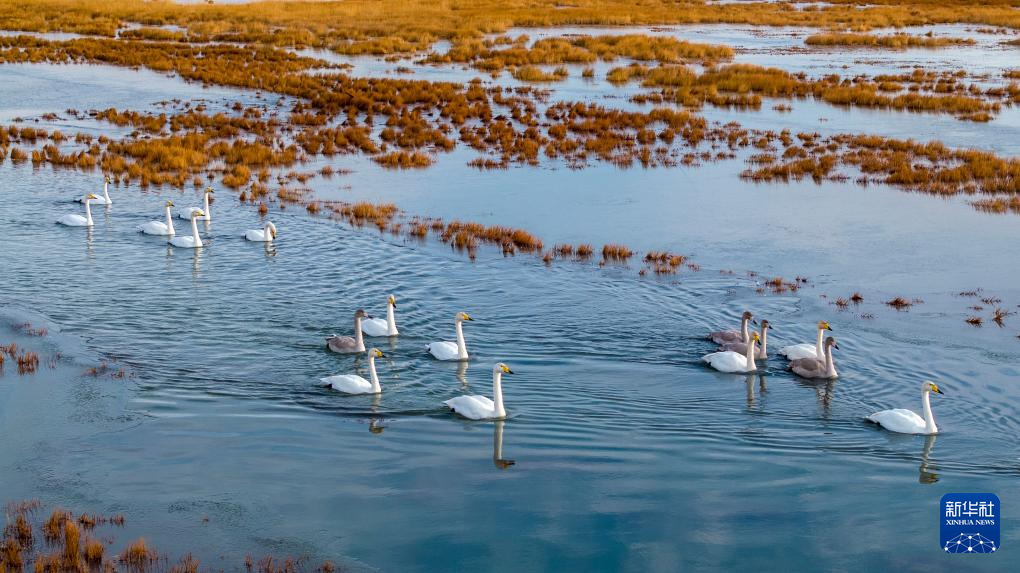 11月12日,甘肃省酒泉市阿克塞哈萨克族自治县阿伊纳乡,天鹅在小苏干湖游弋(无人机照片)。
