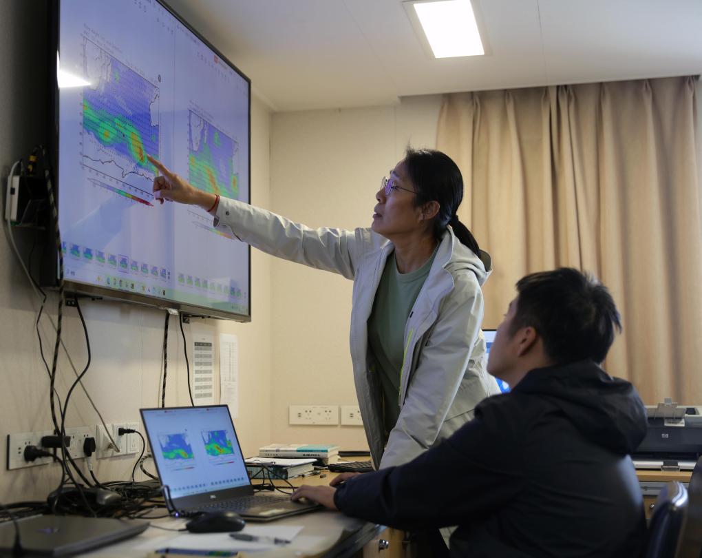 执行中国第41次南极考察任务的“雪龙”号和“雪龙2”号于北京时间2024年11月19日开始穿越“咆哮”西风带。这是“雪龙2”号随船气象保障员刘素芳(左)在研判天气情况,规划航行路线。新华社记者黄韬铭摄