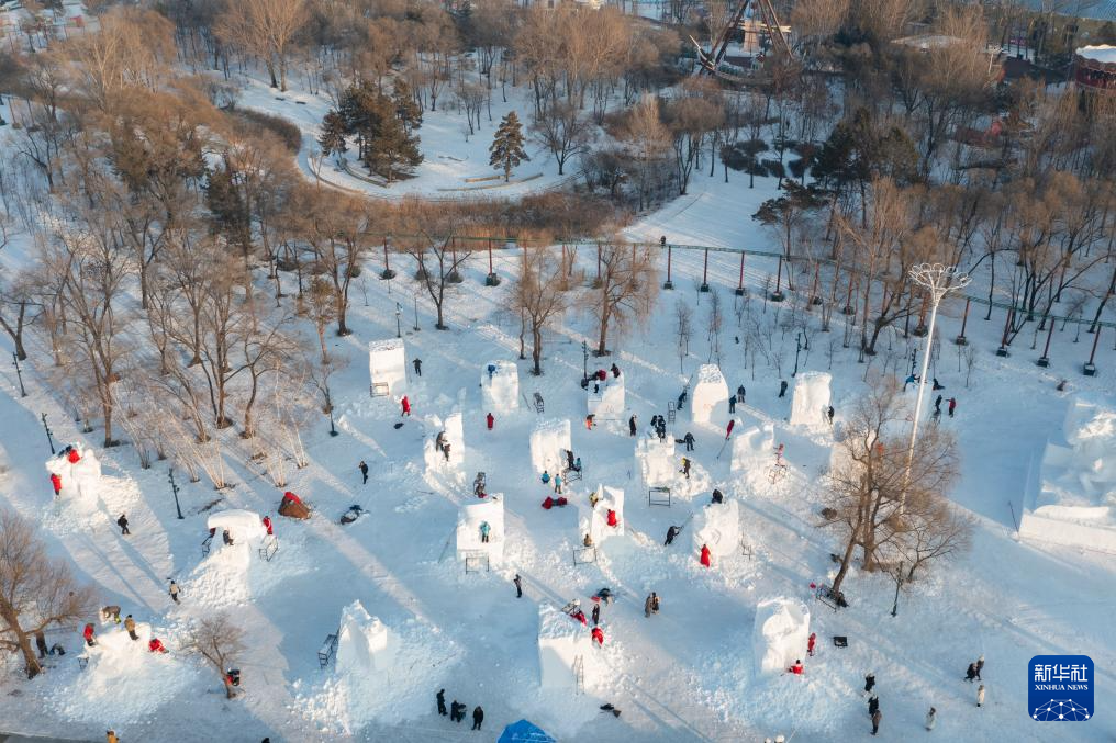1月6日,参赛选手在哈尔滨太阳岛雪博会园区进行雪雕创作(无人机照片)。