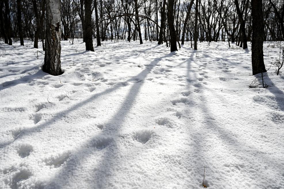 在内蒙古额尔古纳国家级自然保护区生态廊道内,野生动物在积雪上留下的足迹(3月25日摄)。新华社记者连振 摄