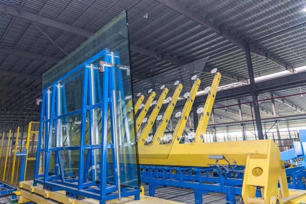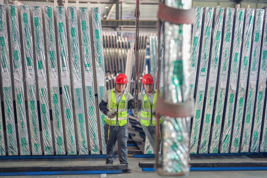 4月18日,在重庆市永川区,一家玻璃生产企业的工作人员在成品车间吊运即将通过西部陆海新通道发货的镀膜玻璃。