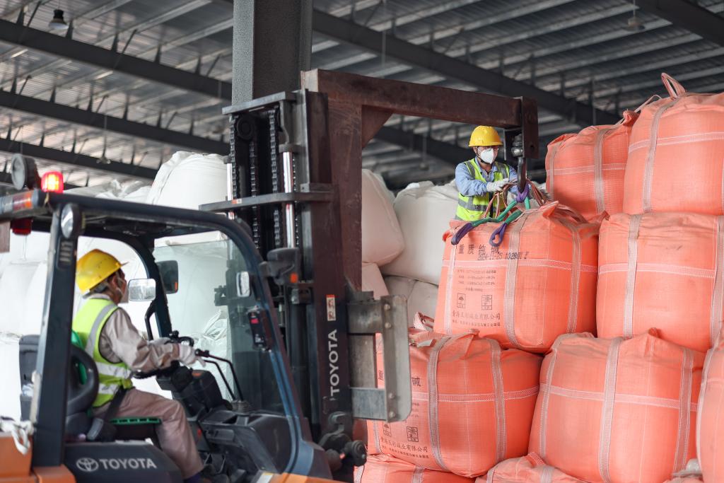4月18日,在重庆市永川区,一家玻璃生产企业的工作人员在原料车间码放依托陆海新通道从青海运输过来的纯碱。