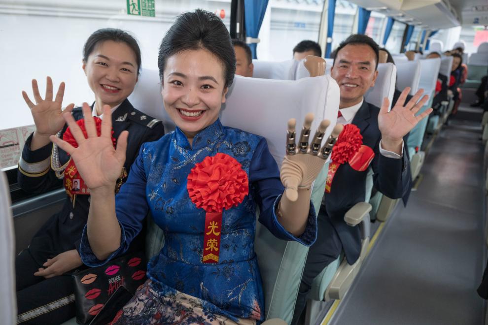 5月16日,参加第七次全国自强模范暨助残先进表彰大会的张超凡(左二)在大巴上挥手致意(她戴有智能仿生手),她荣获“全国自强模范”称号。新华社记者才扬 摄