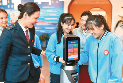 在山东省胶济铁路青岛博物馆,国铁济南局青岛客运段助盲志愿者引导来自潍坊盲校的孩子与车站服务机器人互动。王海滨摄(新华社发)