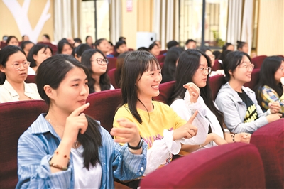 在广西壮族自治区桂林市聋哑学校举办的手语公益大课堂上,大学生志愿者学习手语。李 凯摄(人民图片)