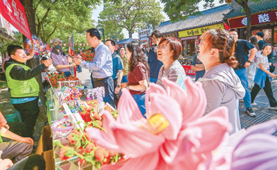 5月18日,山东省青州市古城景区举办全国助残日活动。图为游客在选购由残疾人制作的手工艺品。王继林摄(人民图片)