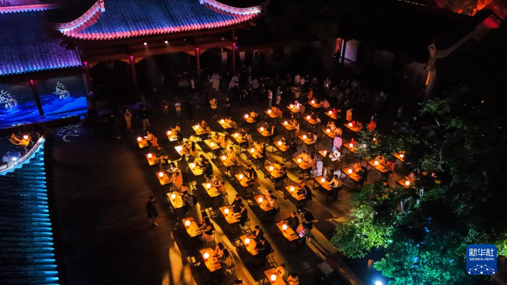 5月10日,沉浸式演出《今上岳阳楼》在岳阳楼景区上演(无人机照片)。