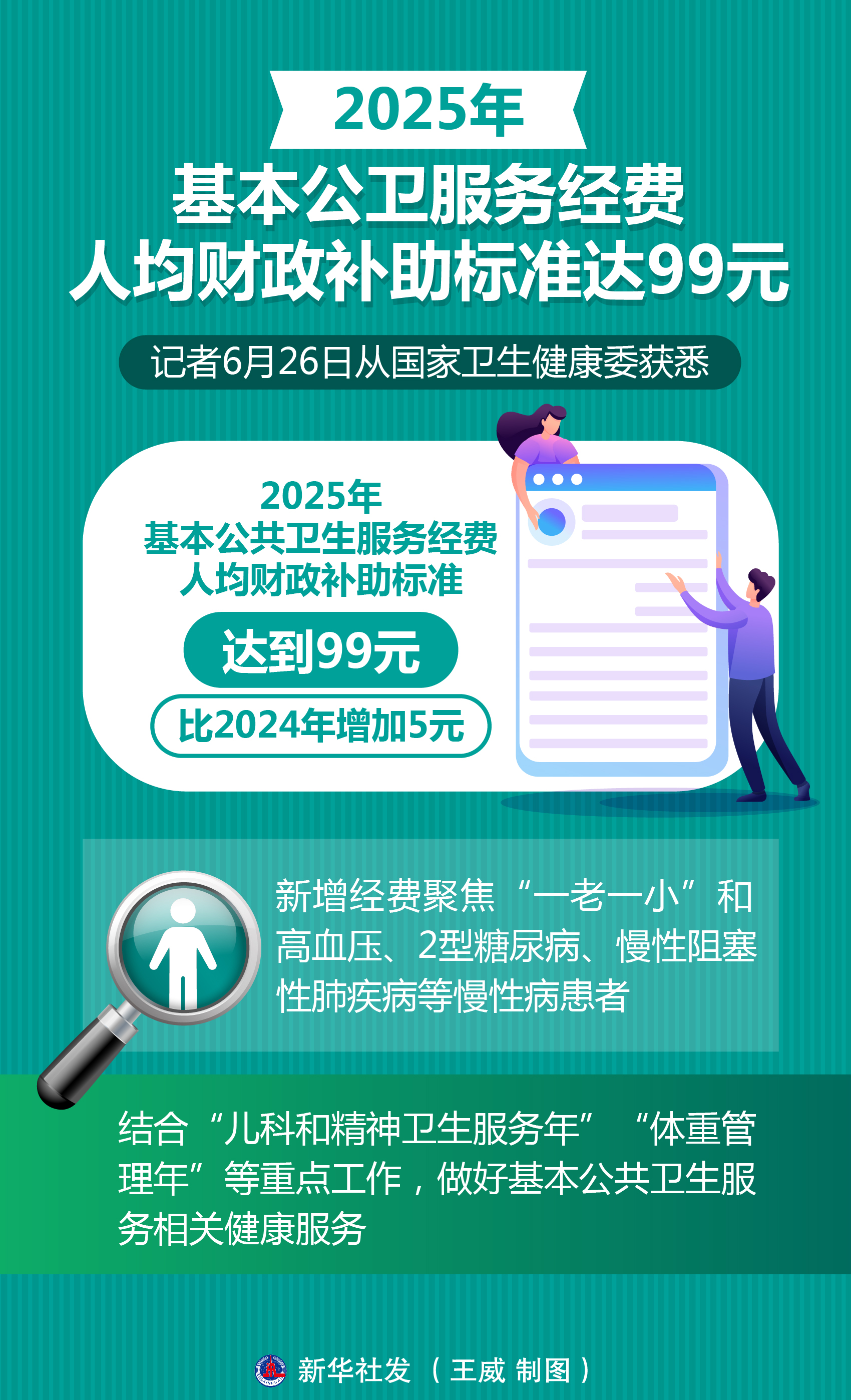 新华社北京6月26日电(记者董瑞丰)记者26日从国家卫生健康委获悉,2025年基本公共卫生服务经费人均财政补助标准达到99元,比上年增加5元。