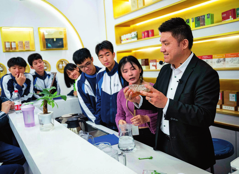澳门居民黄滋才(右一)在位于横琴的分子态(珠海横琴)中医药健康产业发展有限公司的植物(现代中药)分子博物馆内与澳门劳校中学的学生交流(2024年12月11日摄)新华社发(张金加摄)