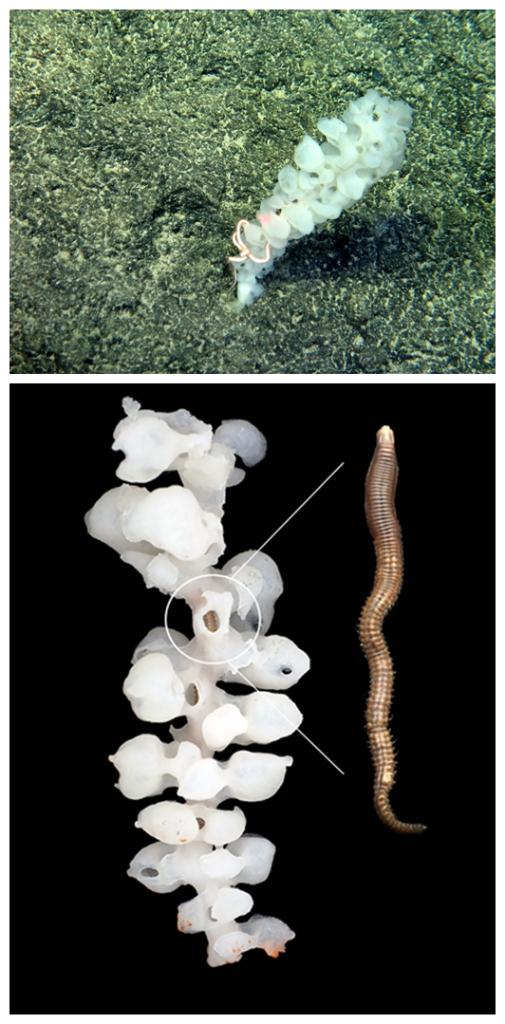 “蛟龙号”采集的死亡烟囱及其中发现的领多栉虫。(新华社发)