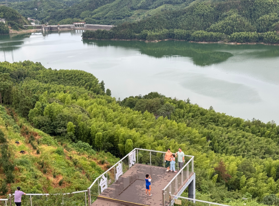 游客在广福村观鸟台上合影留念,远处是钓鱼台水库。新华网 吴京泽 摄