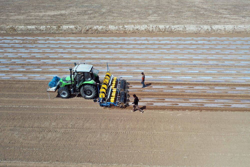 ↑2022年4月7日,在新疆阿图什市格达良乡的棉田里,装有北斗卫星导航系统的播种机在作业(无人机照片)。新华社发(杨林 摄)