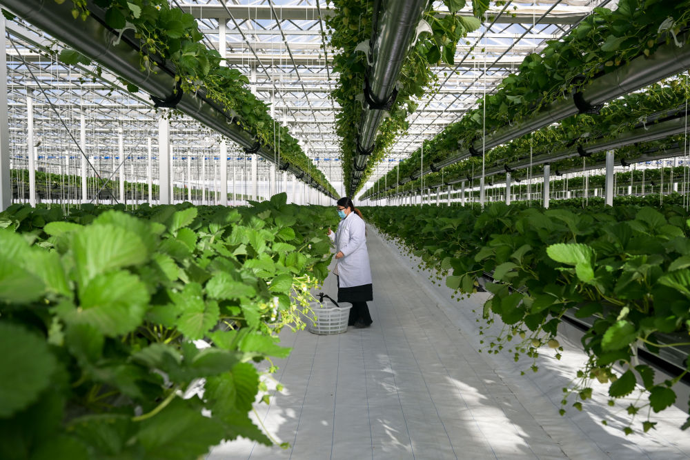 ↑2023年12月7日,工作人员在达拉特旗现代数字农业科技产业园管护草莓秧苗。新华社记者 李志鹏 摄