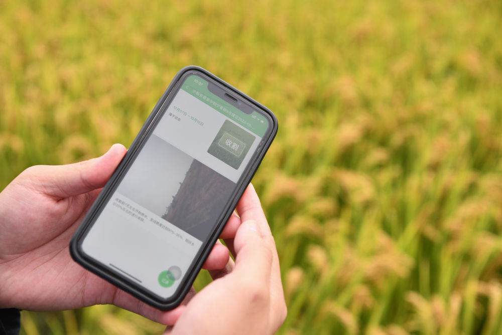 ↑2022年10月9日,在安徽芜湖中联智慧农业峨桥示范基地内,工作人员通过手机终端了解稻田合适的收割时间。新华社记者 张端 摄