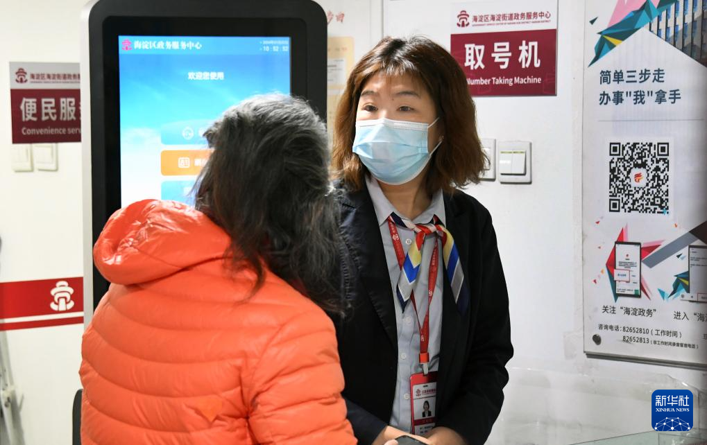 1月2日,北京市海淀区海淀街道政务服务中心的工作人员(右)为市民解答问题。