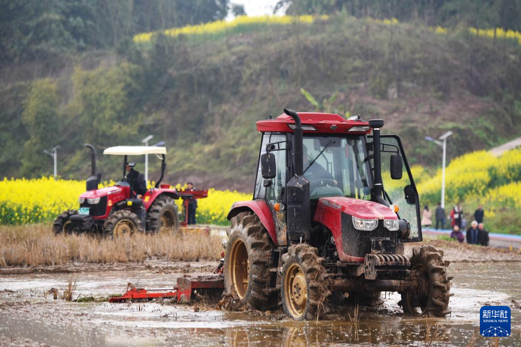 3月19日,在重庆市长寿区新市街道红土地村,稻农驾驶拖拉机翻耕田地。