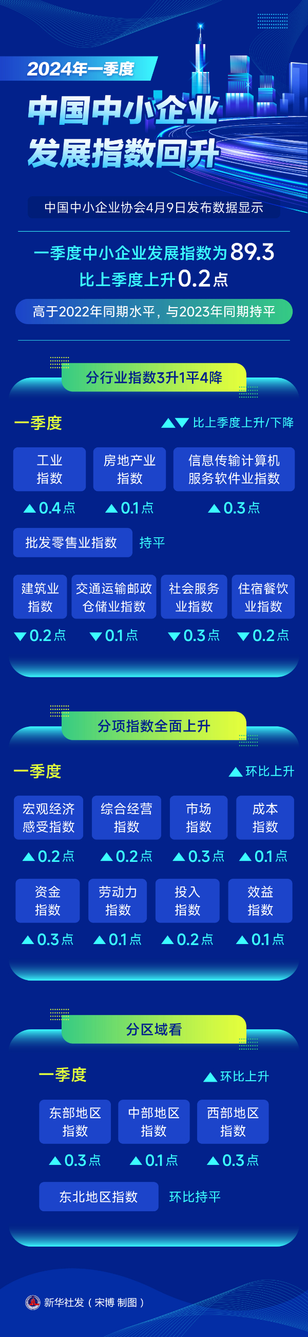 新华社北京4月9日电(记者唐诗凝)中国中小企业协会9日发布数据显示,一季度中小企业发展指数为89.3,比上季度上升0.2点,高于2022年同期水平,与2023年同期持平。