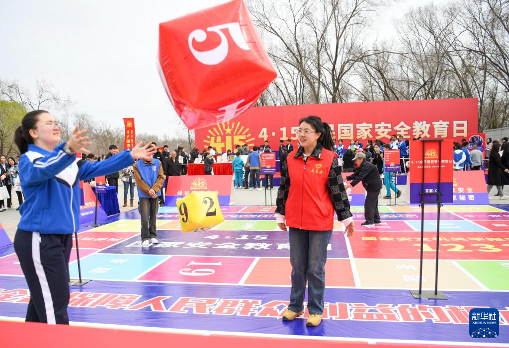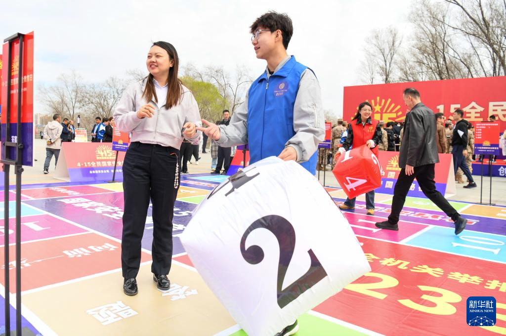 4月11日,在新疆乌鲁木齐市水磨沟区水塔山总体国家安全观主题公园,市民通过参与飞行棋闯关答题活动了解国家安全知识。