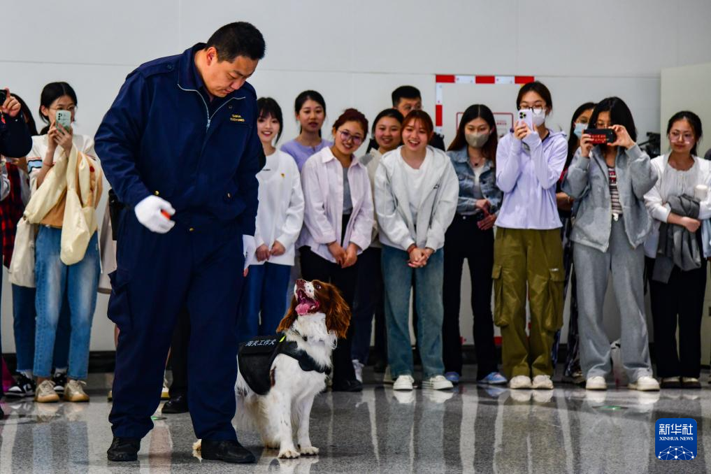 4月12日,在济南遥墙国际机场,济南海关工作人员进行工作犬演练。