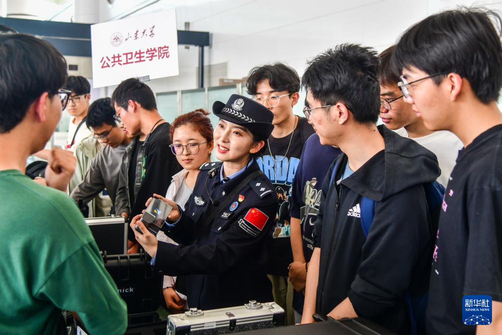 4月12日,在济南遥墙国际机场,济南边检站民警向山东大学公共卫生学院师生介绍警用器械。