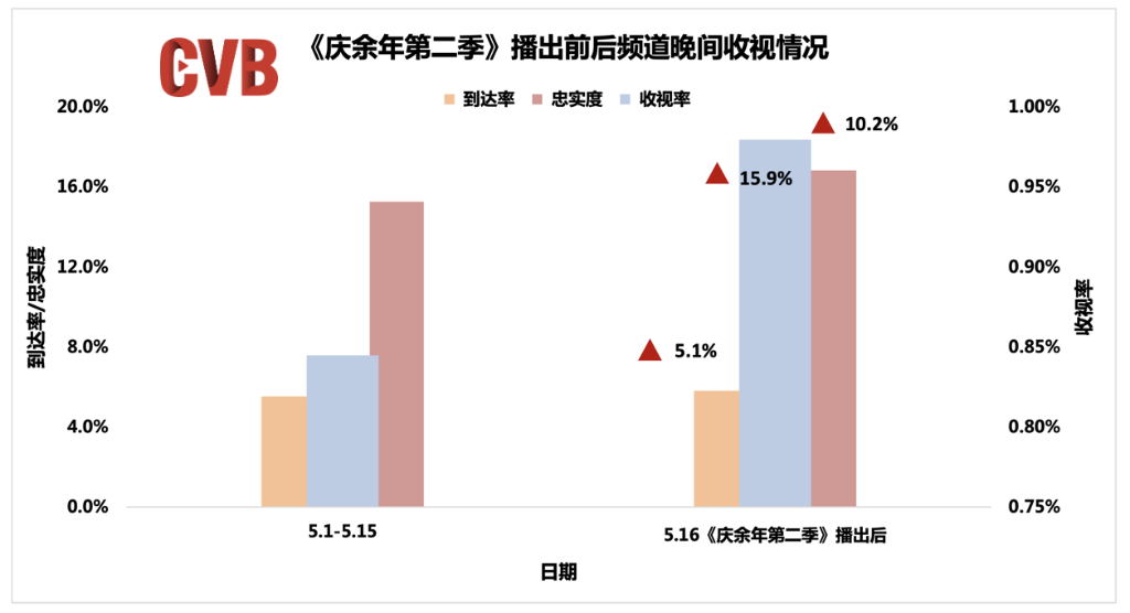 《庆余年(第二季)》播出期间收视一路走高,大结局集较首集上涨48.4%,带动CCTV8晚间收视用户规模与收视黏性整体提升。东方卫视、浙江卫视同步播出《庆余年(第一季)》,剧情重温,收视同步上涨。