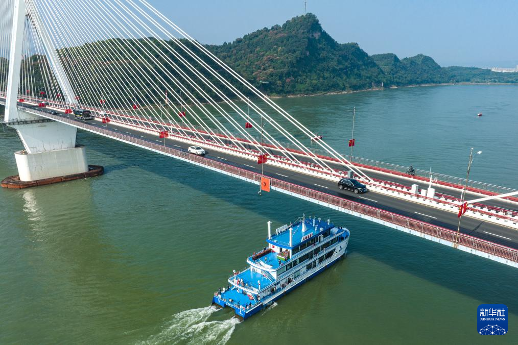 2023年10月11日,我国首艘氢燃料电池动力示范船“三峡氢舟1”号行驶在长江湖北宜昌水域(无人机照片)。