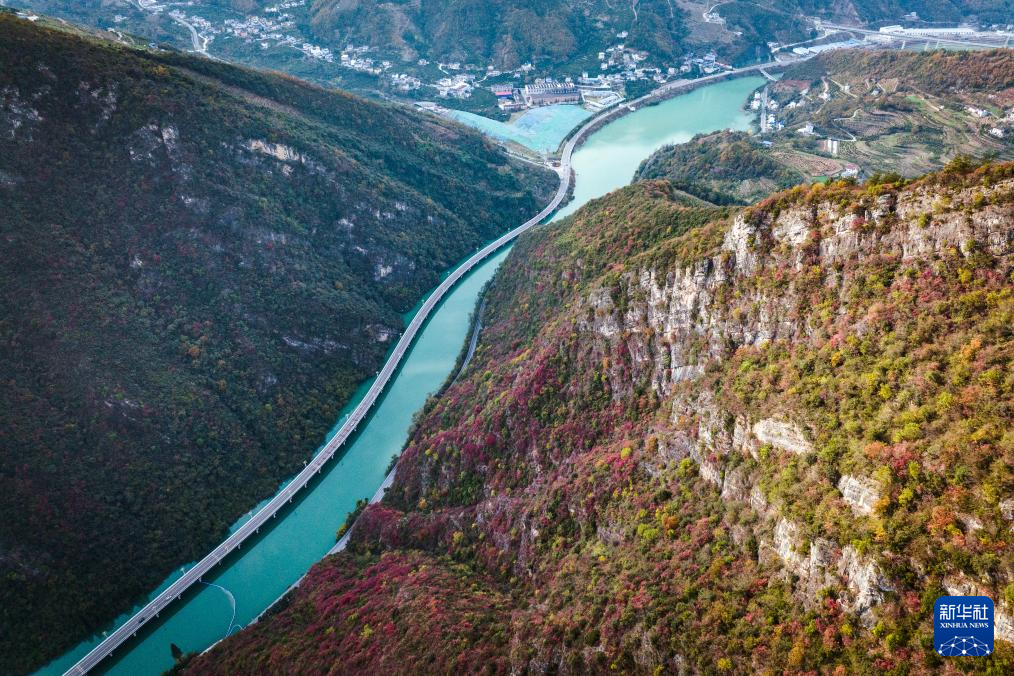2023年12月2日,汽车行驶在湖北宜昌市兴山县水上公路上(无人机照片)。