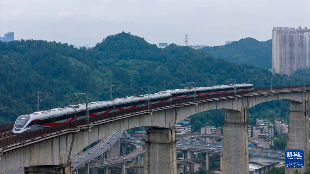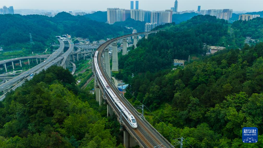 6月14日,动车组列车在贵州省贵阳市境内行驶(无人机照片)。