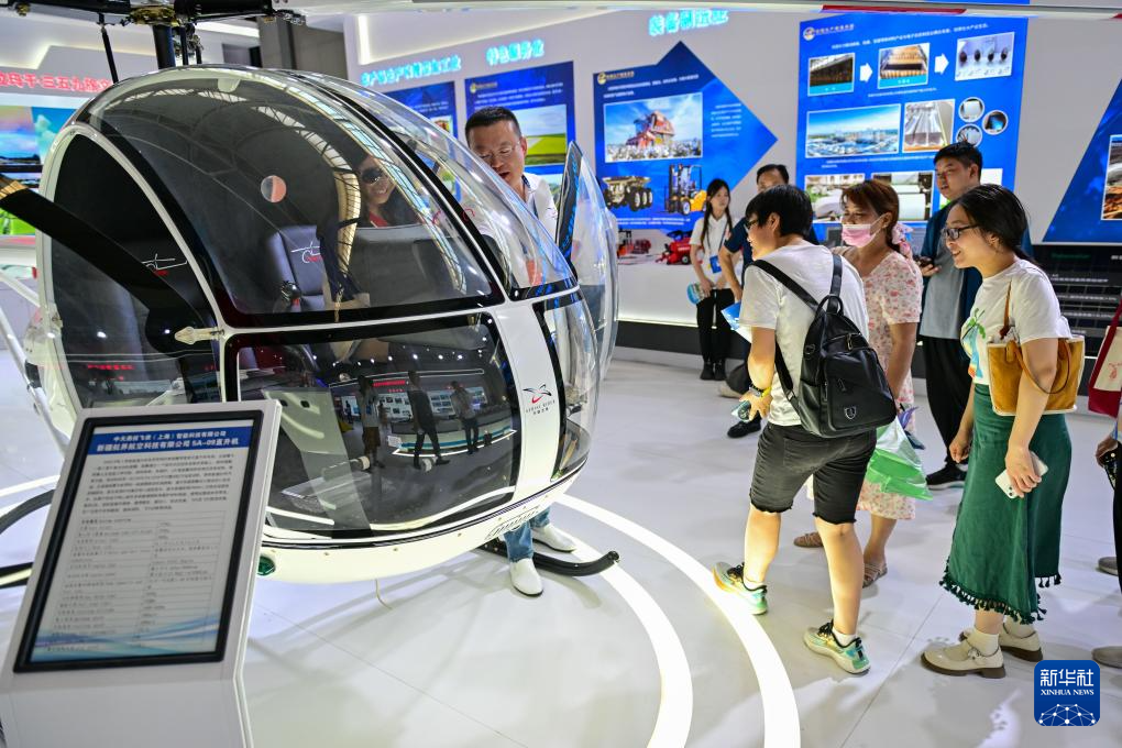 6月27日,在第八届中国-亚欧博览会上,参观者在新疆生产建设兵团展区查看本土企业生产的5A-09直升机。
