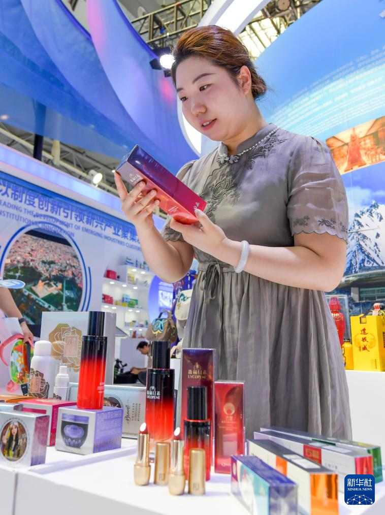 6月26日,在第八届中国—亚欧博览会上,工作人员在乌鲁木齐展区摆放亲努尔生物科技有限公司自主研发的番茄红素经典护肤系列化妆品。
