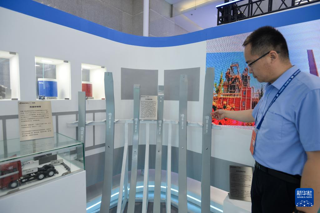 6月30日,在第八届中国—亚欧博览会上,新疆八钢金属制品有限公司工作人员展示公司产品。