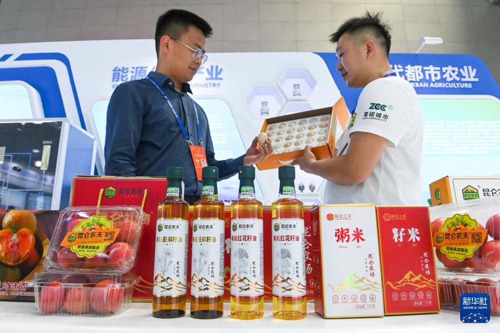 6月28日,在第八届中国—亚欧博览会上,新疆国杰农业科技有限公司工作人员(右)在向参展商介绍该公司在乌鲁木齐县水西沟镇平西梁村昆仑农场零碳农业科技示范园种植生产的农产品。